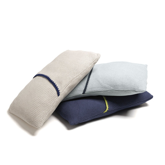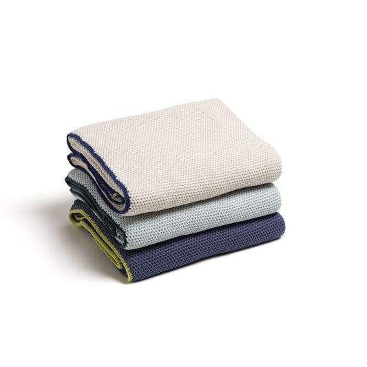 Los plaids y cojines Riso hechos de punto de algodón suave, ligero y mullido, son un complemento ideal para tomar el fresco en la tumbona. Sus colores arena, turquesa o azul están inspirados en nuestro querido paisaje mediterráneo.